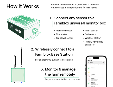 Farmblox uses simple sensors placed around your farm to track conditions like water flow, tank levels, electrical connection, temperature, and weather. These sensors connect to the Farmblox Universal Monitor which sends information wirelessly – even without internet – to the Base Station, which transmits information to your phone, tablet or computer.